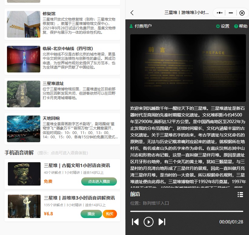 第二种:第三方小程序免费讲解,在微信和抖音都有的“游堆堆小程序”,无需下载APP,搜索即可进入使用。该小程序采用“看广告解锁免费讲解”模式,观看少量视频广告后,可免费收听全程近1小时的语音讲解,内容不仅覆盖全馆最重要的文物,还延伸了发掘故事、文物修复历程。