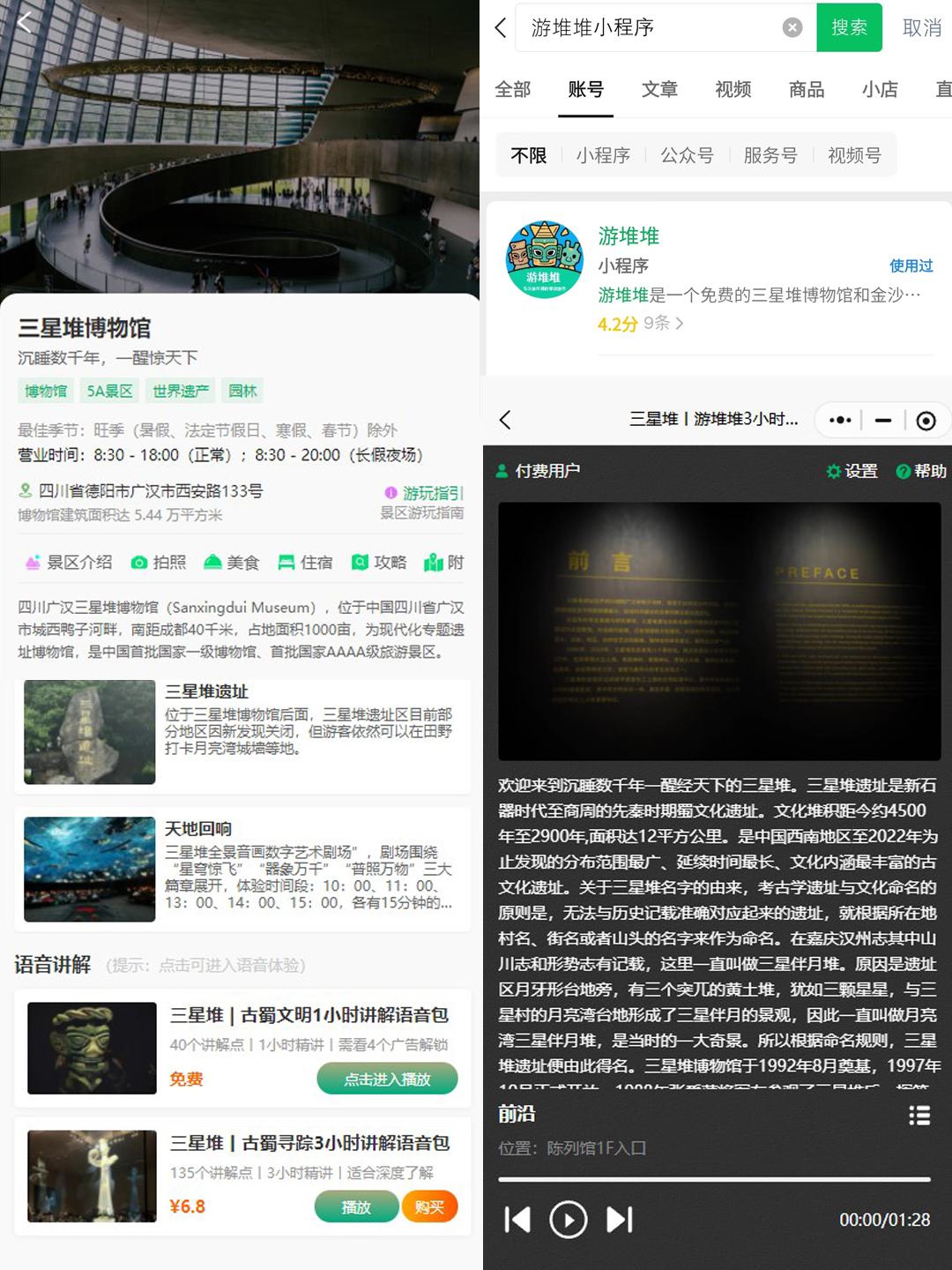 如果大家不想约人工讲解或需要提前了解自己是否适合听语音讲解,大家可以V📧是搜索:“游堆堆小程序”,上面提供了两套三星堆博物馆的语音讲解,一套是一个小时用于简单导览的免费版,一套是三小时用于简单易懂了解三星堆来龙去脉的收费版,强烈建议大家可以提前试用一下,以便了解三星堆什么讲解方式适合你!